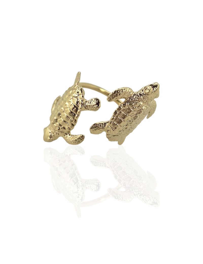 Anell de plata 925 xapat en or de 18kt. ajustable al dit amb dues figures d’una tortuga.