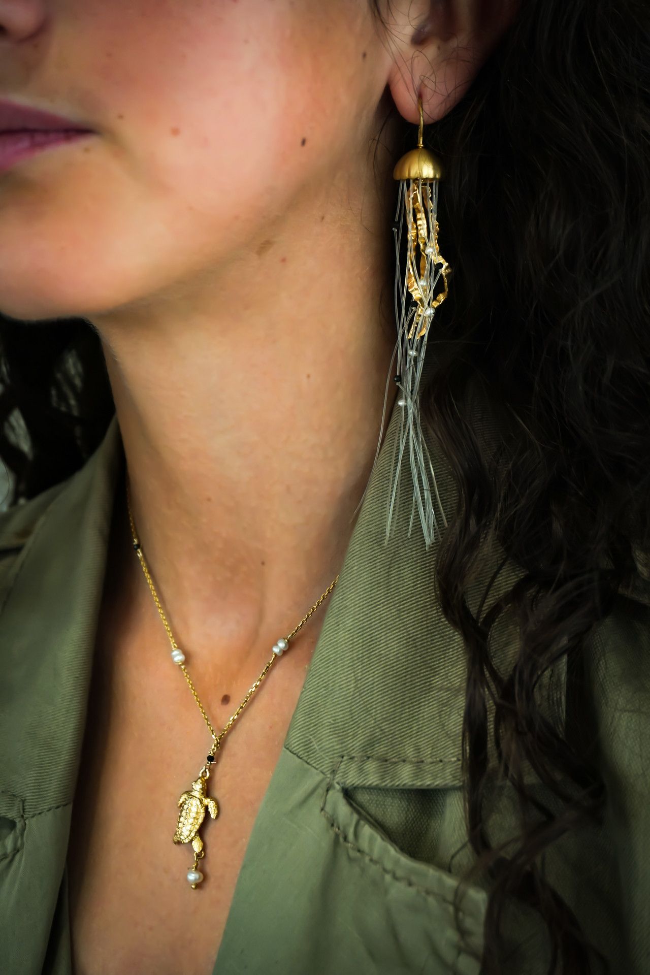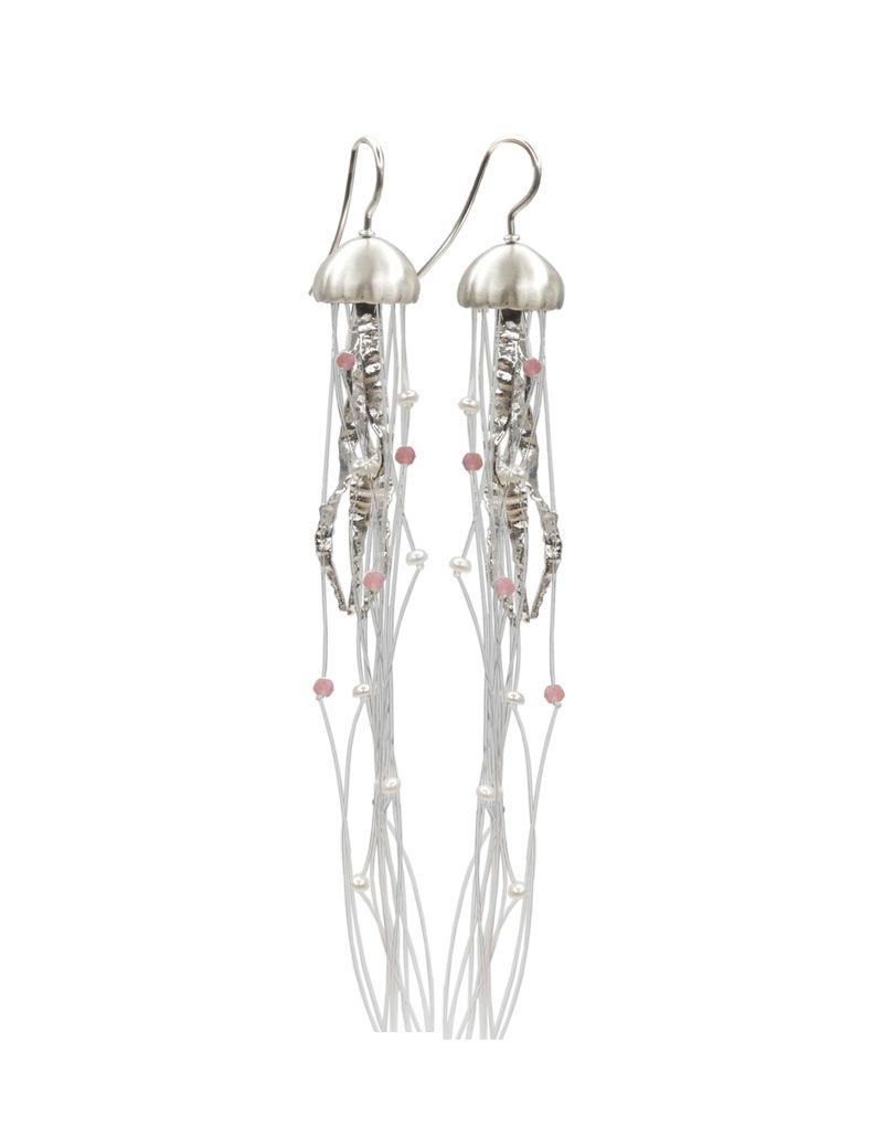 Arracades de plata 925 de 12 cm de llarg i 1,2 cm de diàmetre acabat mate amb perles i turmalines roses. Tanca en forma de ganxo.