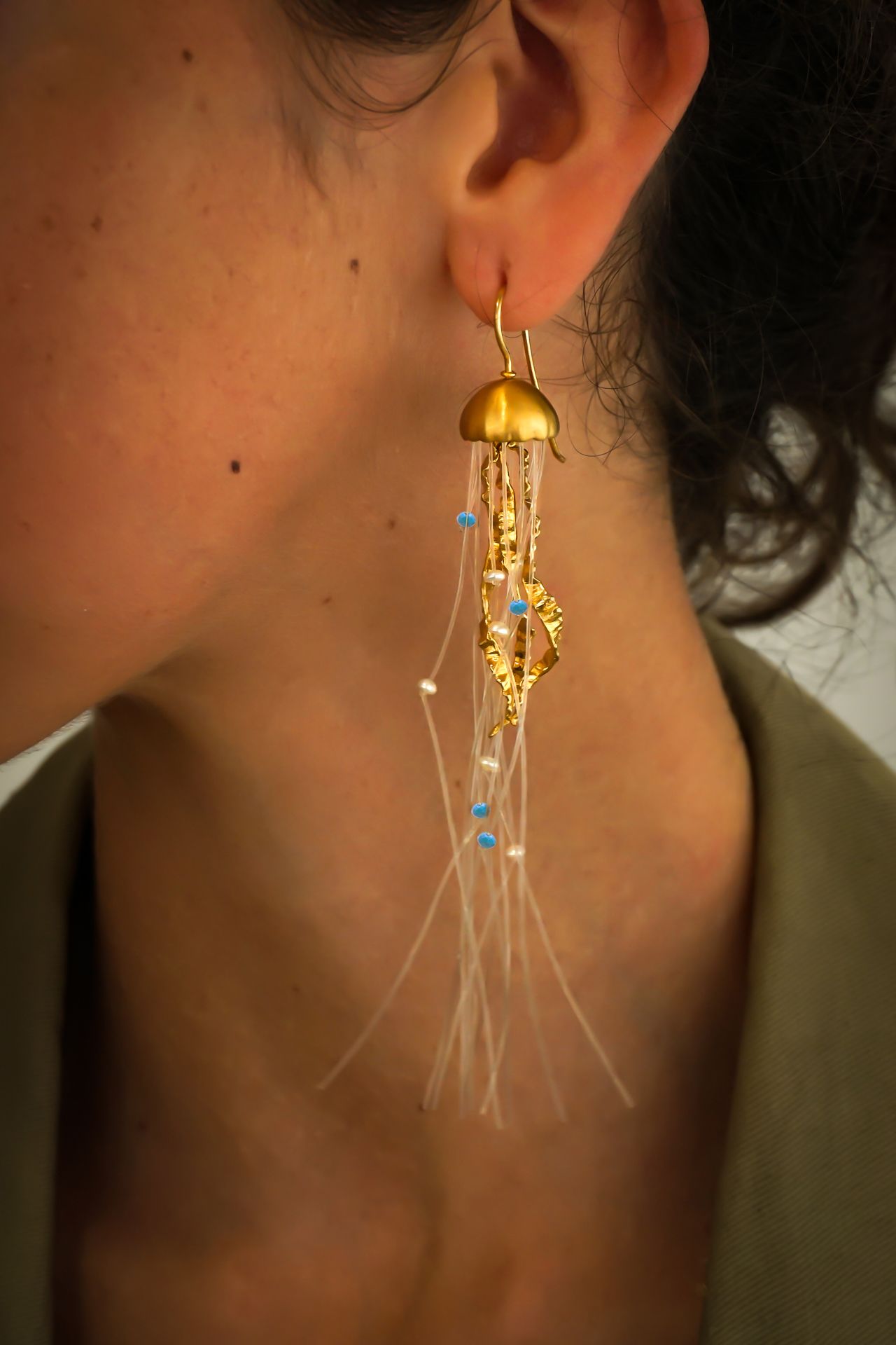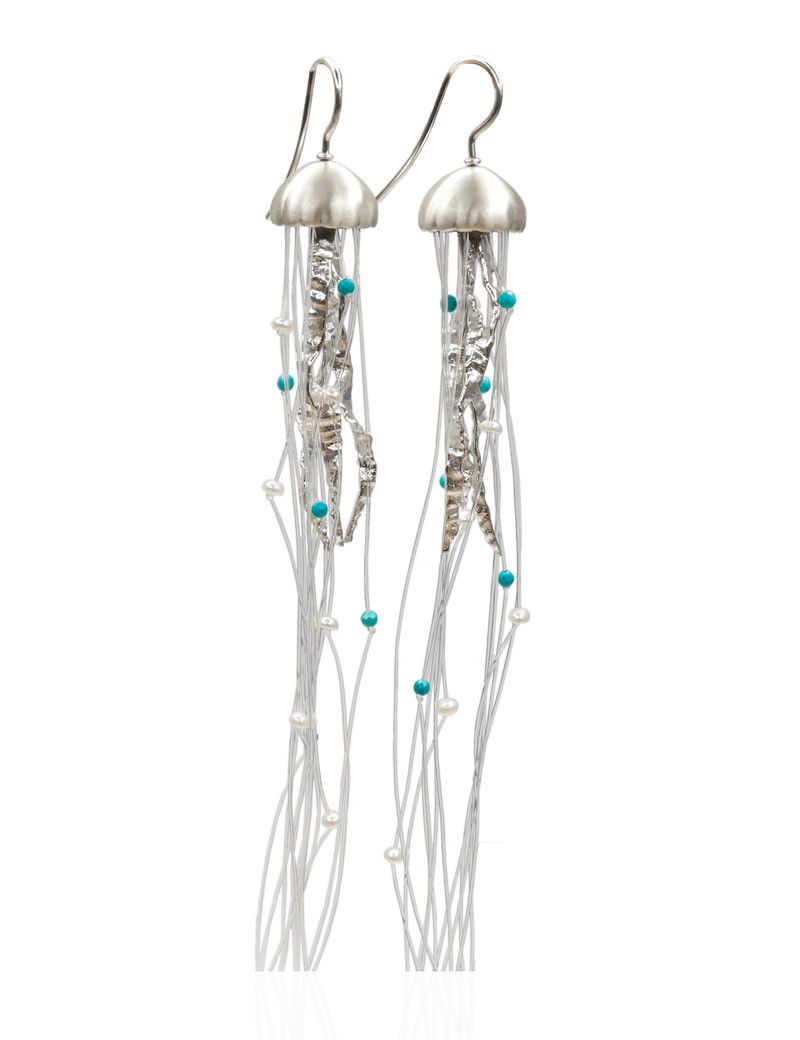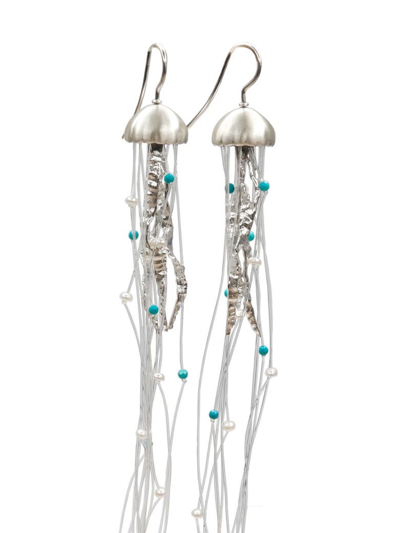 Arracades de plata 925 de 12 cm de llarg i 1,2 cm de diàmetre acabat mate amb perles i turqueses blaves. Tanca amb forma de ganxo.