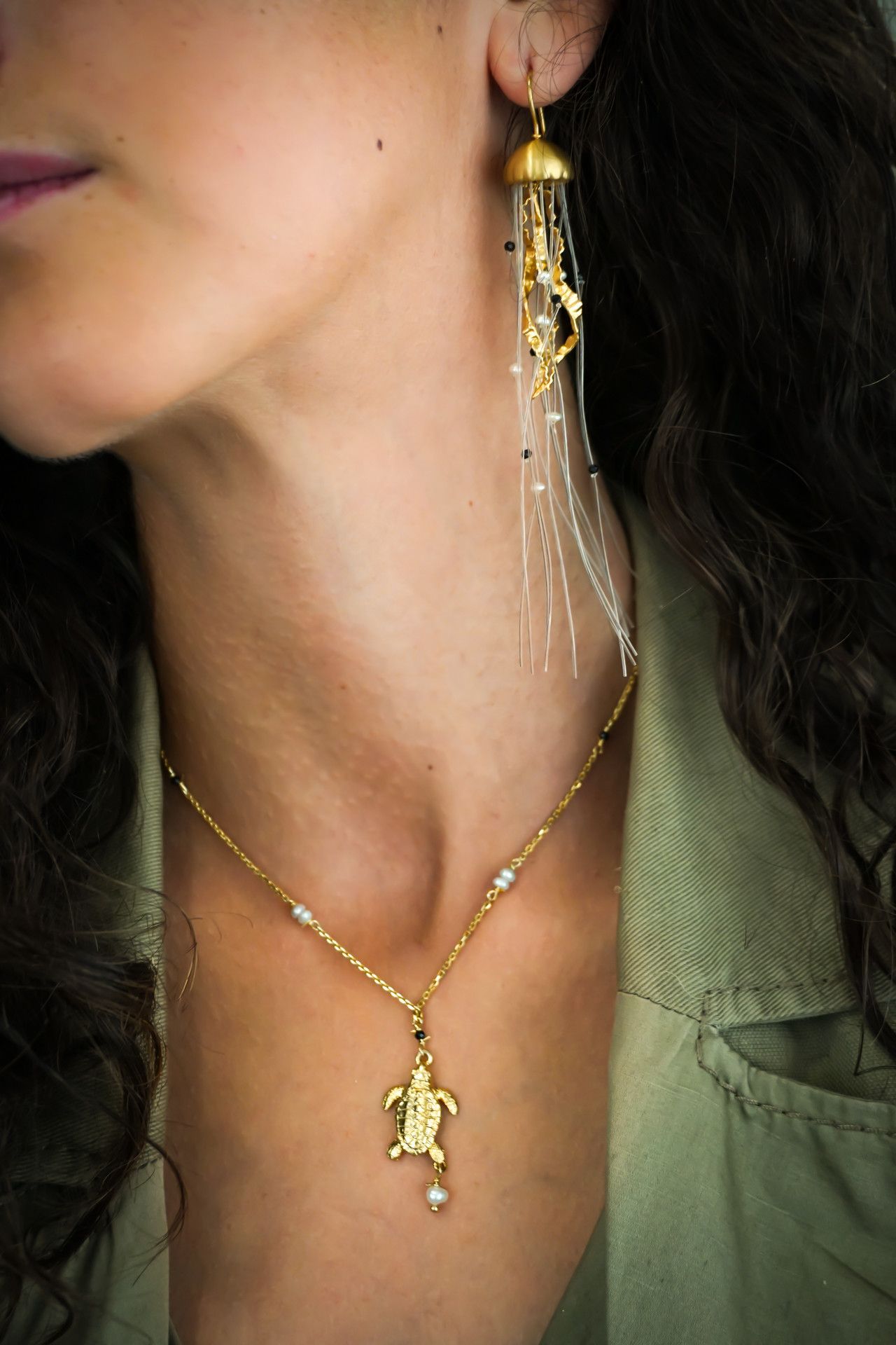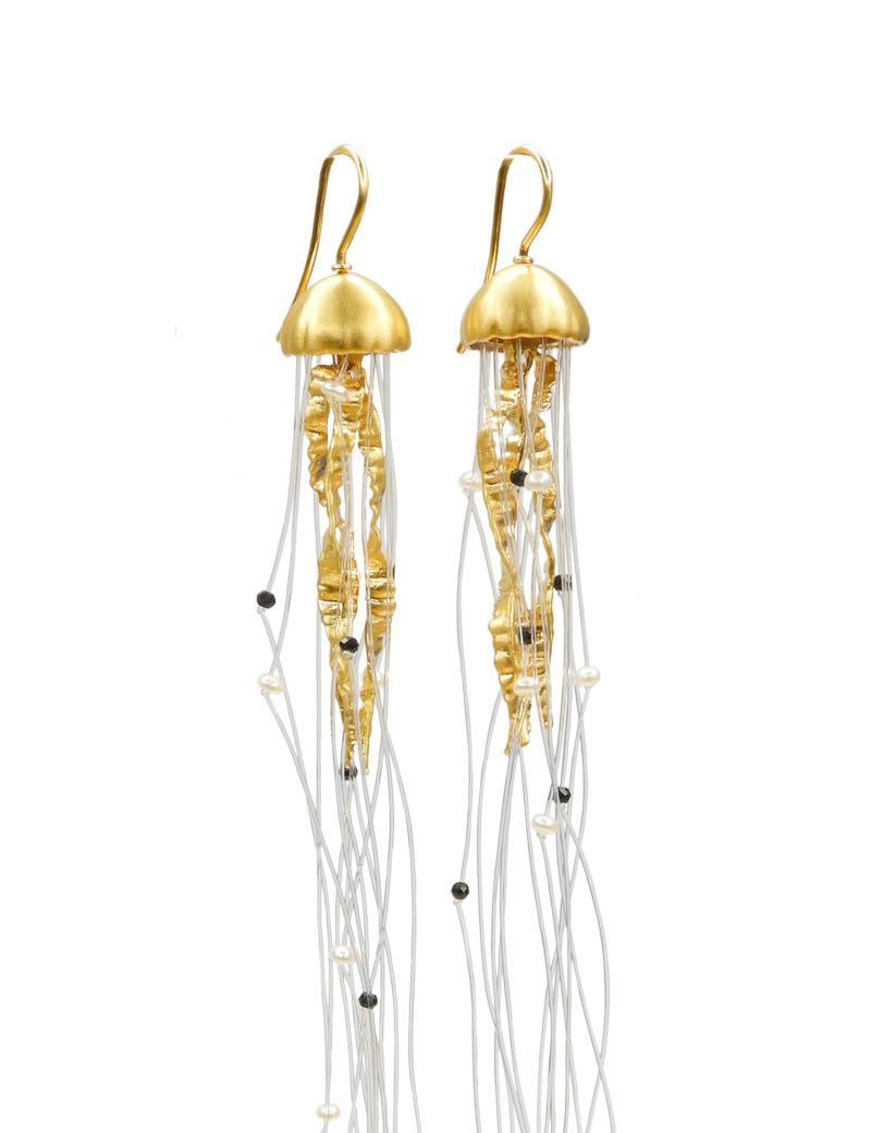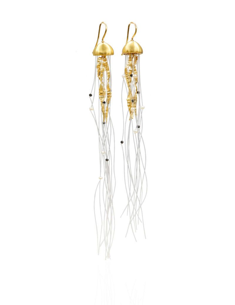 Arracades de plata 925 xapades en or 18kt  de 12 cm de llarg i 1,2 cm de diàmetre acabat mate amb perles i espineles negres. Tanca en forma de ganxo.