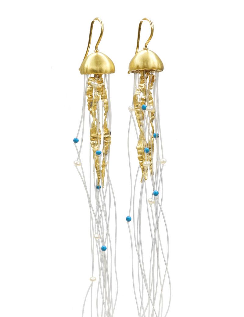 Arracades de plata 925 xapades en or 18kt  de 12 cm de llarg i 1,2 cm de diàmetre acabat mate amb perles i turqueses blaves. Tanca en forma de ganxo.