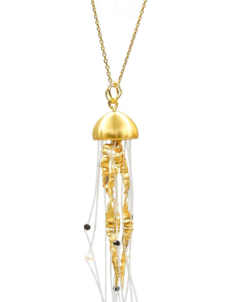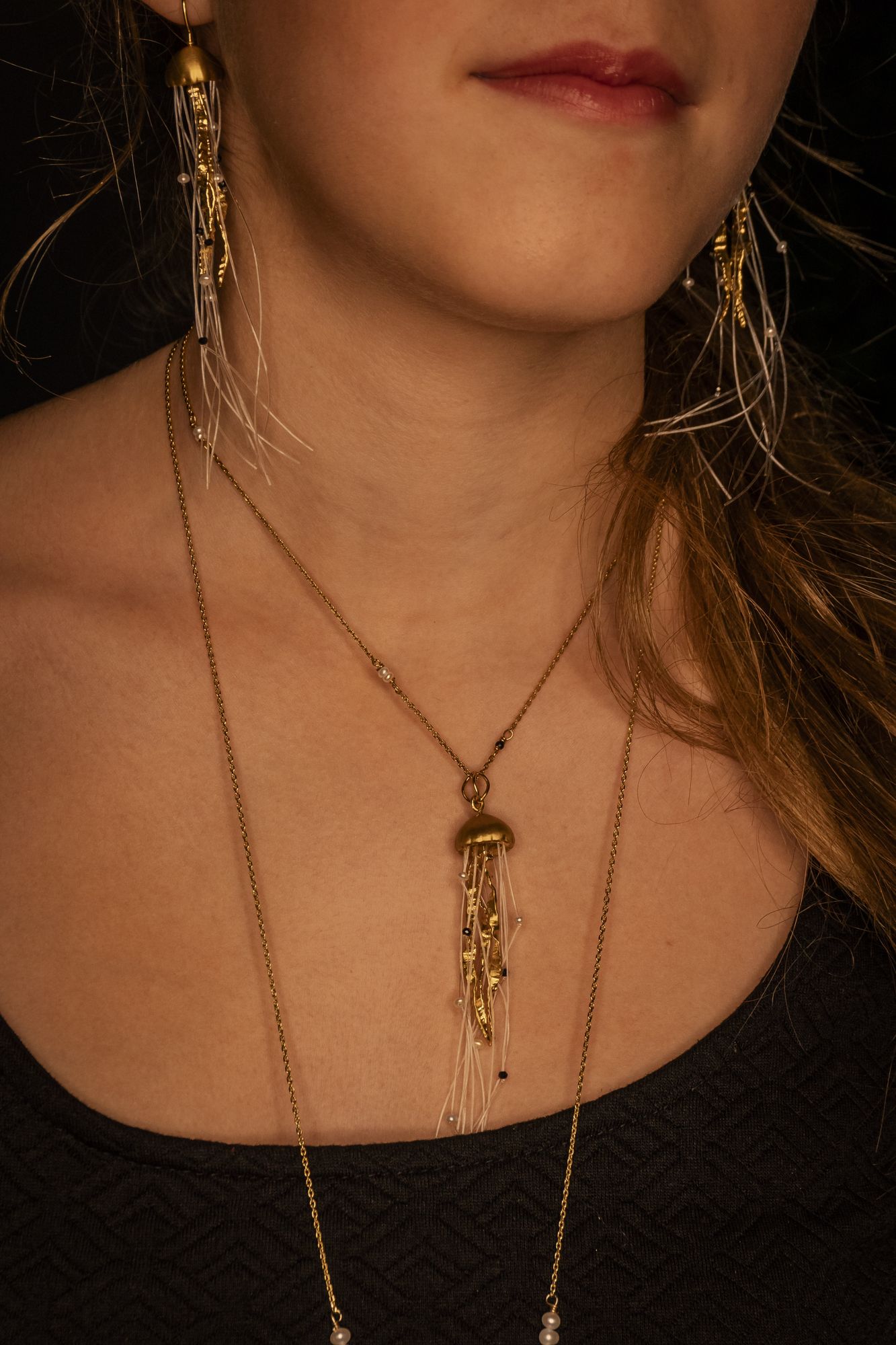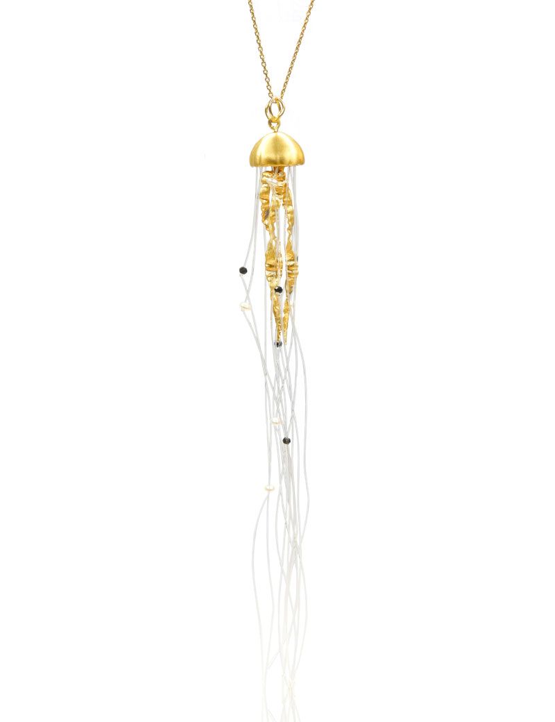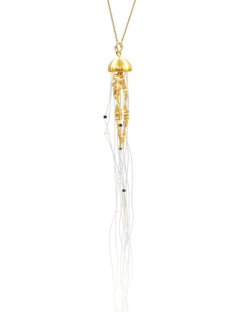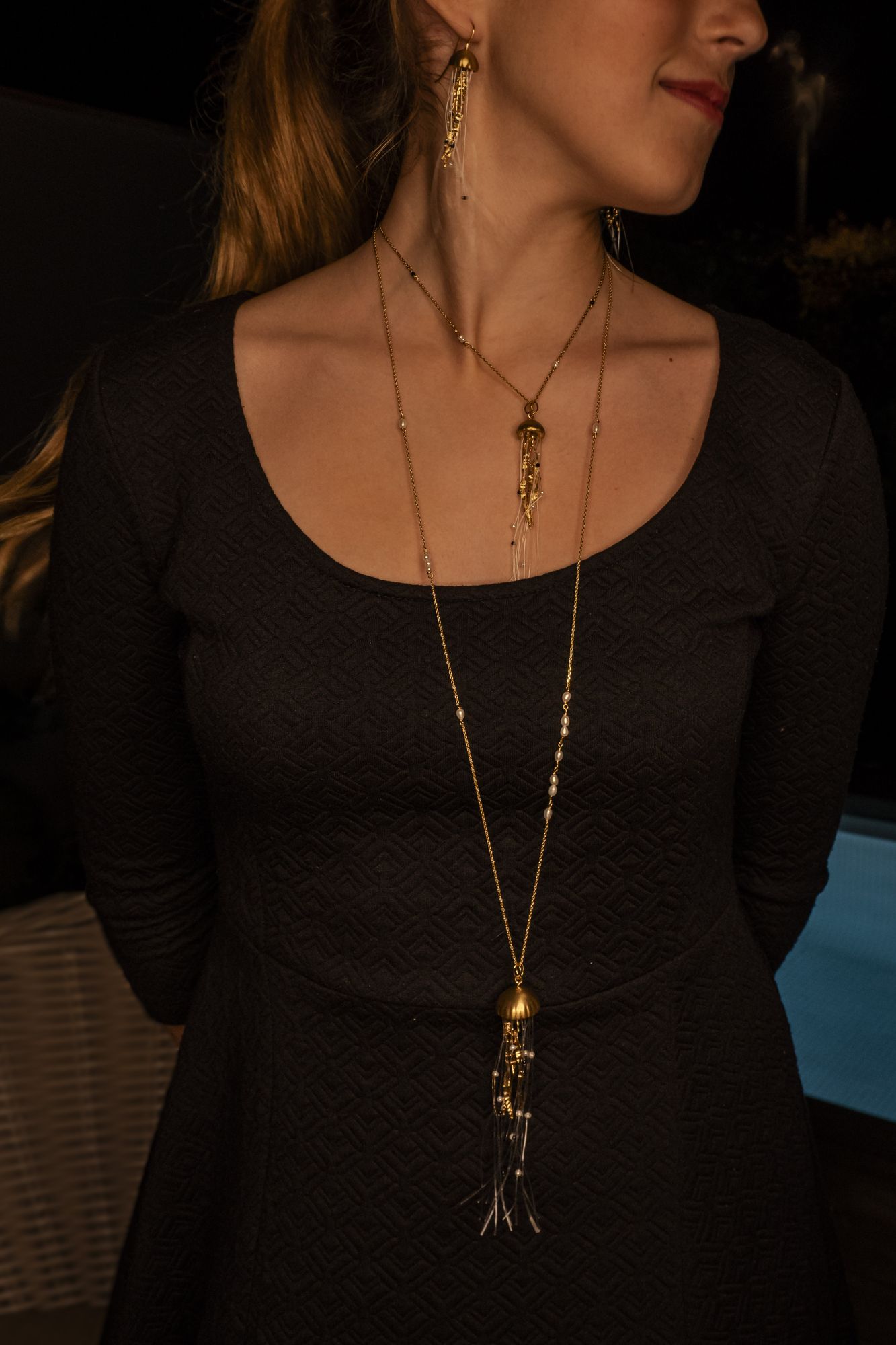 Penjoll de plata 925 xapat en or 18kt de 12 cm de llarg i 1,2 cm de diàmetre acabat mate amb perles i espineles negres. La cadena no està inclosa en el preu. Podeu comprar la cadena a l’apartat COMPLEMENTS.