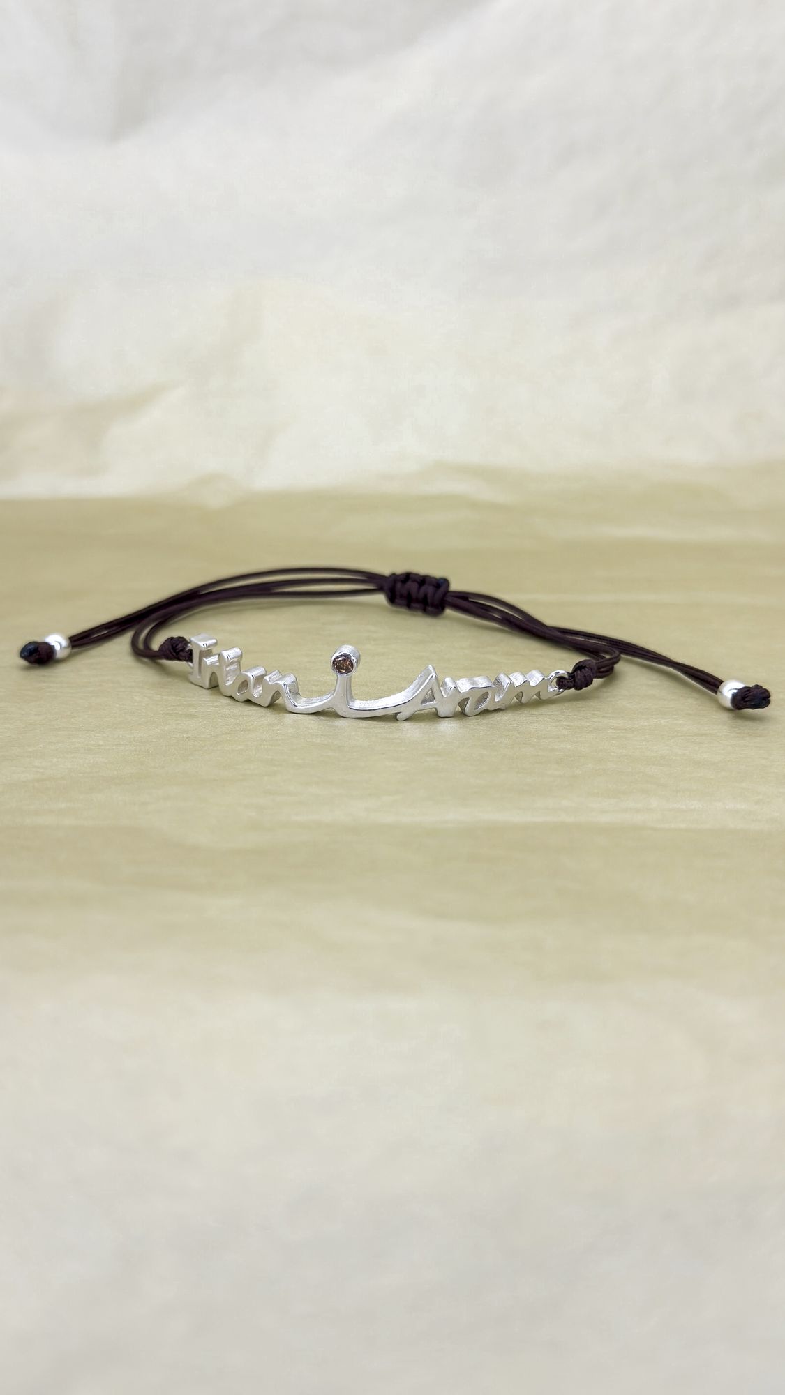 Polsera amb dos noms de plata 925 amb cordó de macramé amb nus ajustable a la mida del canell i dues boletes de plata 925 al final.